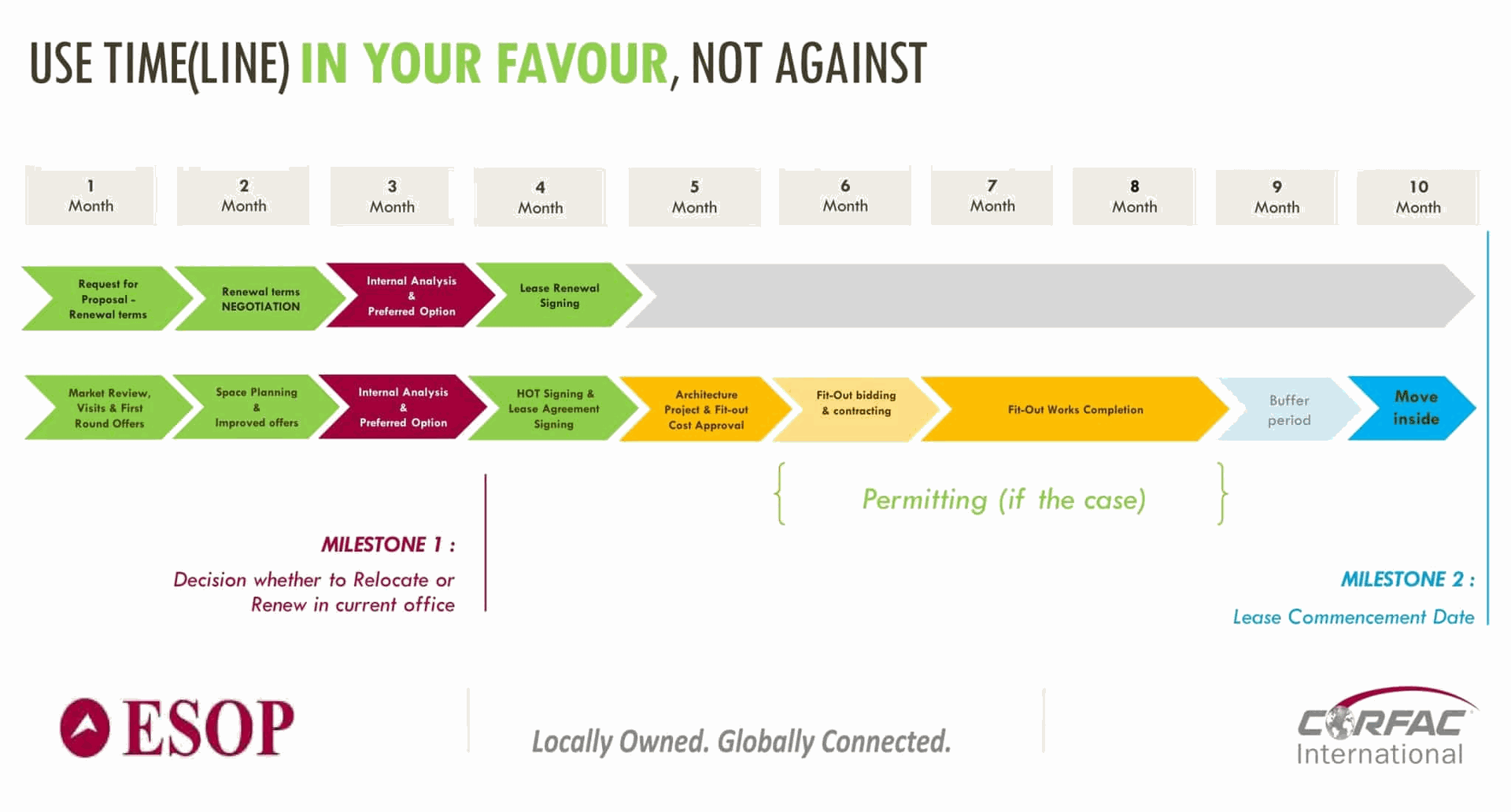 În funcție de dimensiunea companiei și de prevederile contractului actual, procesul trebuie demarat cu 8 – 24 luni înainte de expirarea contractului. Putem personaliza pentru nevoile companiei tale infograficul de mai jos, oferit cu titlu de exemplu.